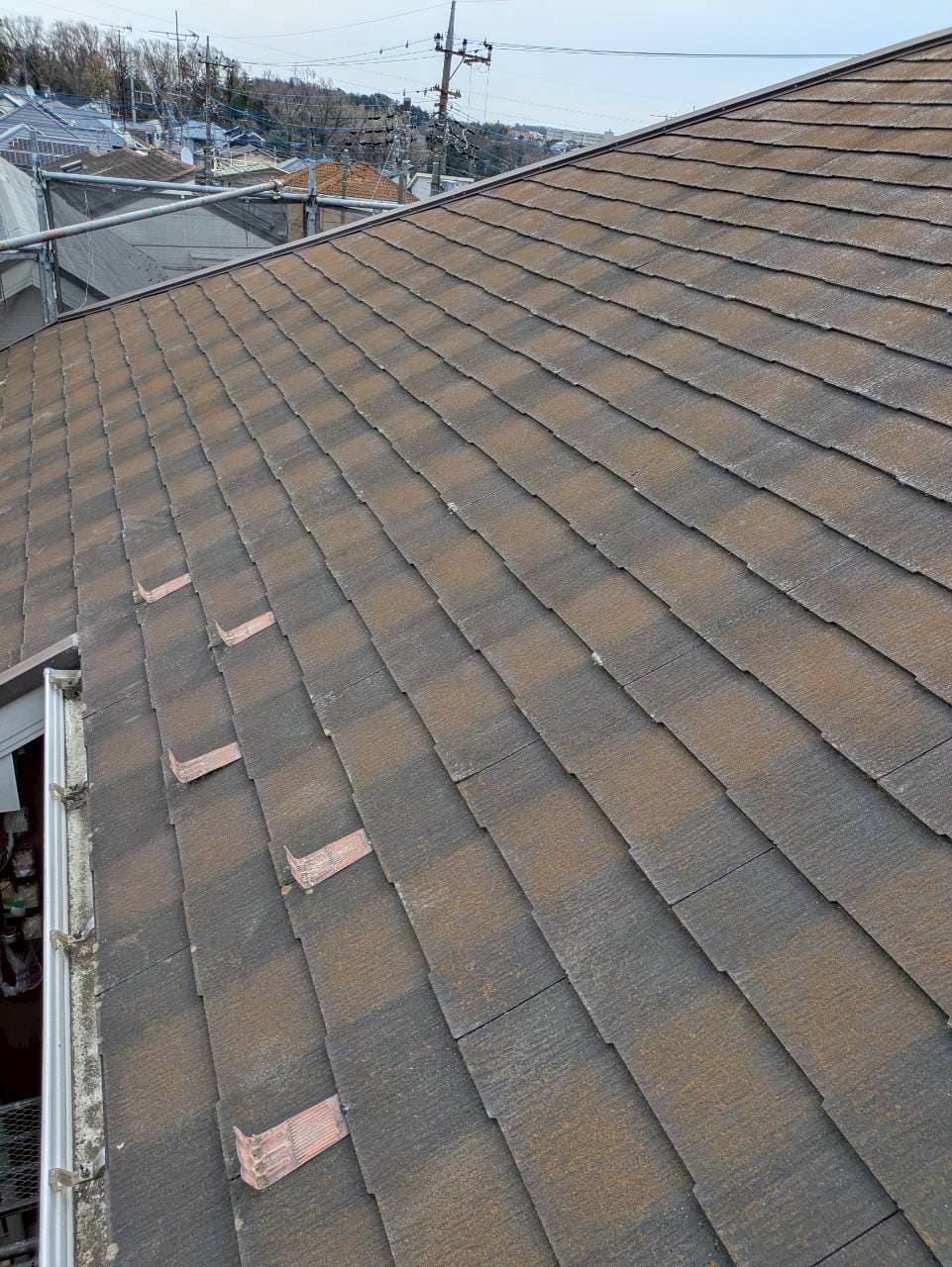 屋根は塗装が難しい屋根材を使用してあったため上葺きさせていただきました。